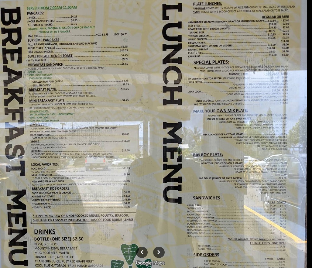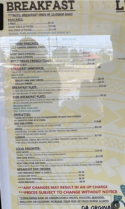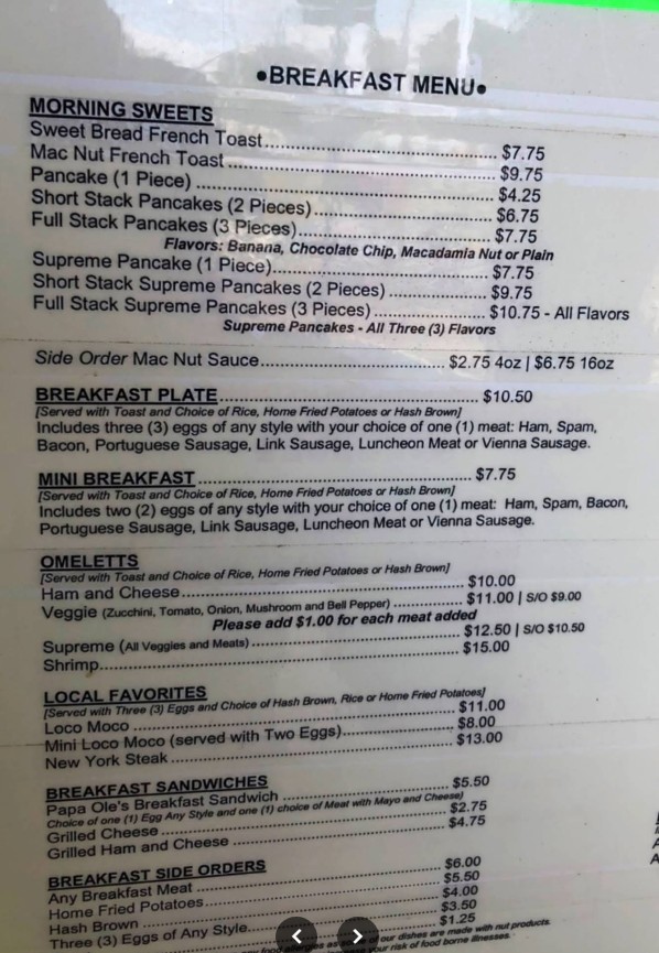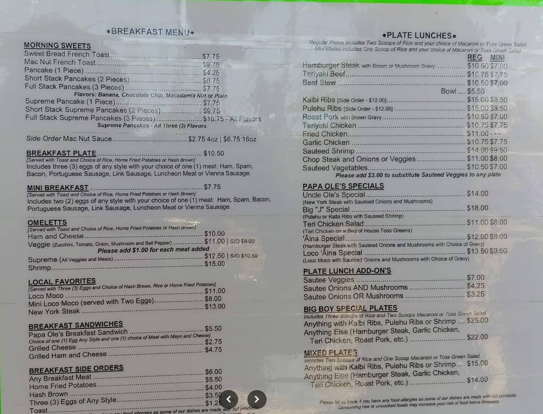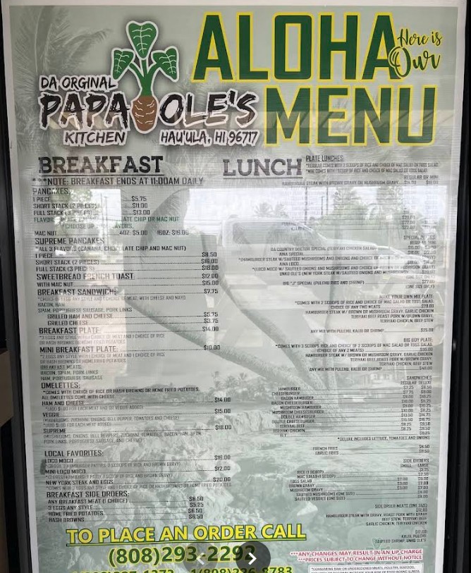 Papa Ole’s Kitchen is a true hidden gem on the North Shore, and the first good sign was seeing the place packed with locals—always a great indicator. It’s not a formal restaurant, but more of a casual spot with picnic tables outside and a take-out style setup. Don’t let the laid-back vibe fool you—the food is absolutely top-tier. We tried the sweet bread French toast and the macadamia nut pancakes, and both were phenomenal. The pancakes come smothered in a rich, custard-based sauce and are topped with a generous handful of macadamia nuts. Every bite was decadent and satisfying, perfectly balancing sweetness and texture. They are cash only, so be prepared—but it’s more than worth it. The portions are generous, the flavors are spot-on, and it’s one of the best meals we’ve had on the island. Whether you’re passing through or staying nearby, Papa Ole’s is a must-visit for breakfast or brunch. Grab your food, find a table, and enjoy the best comfort food Hau‘ula has to offer. Highly recommended!