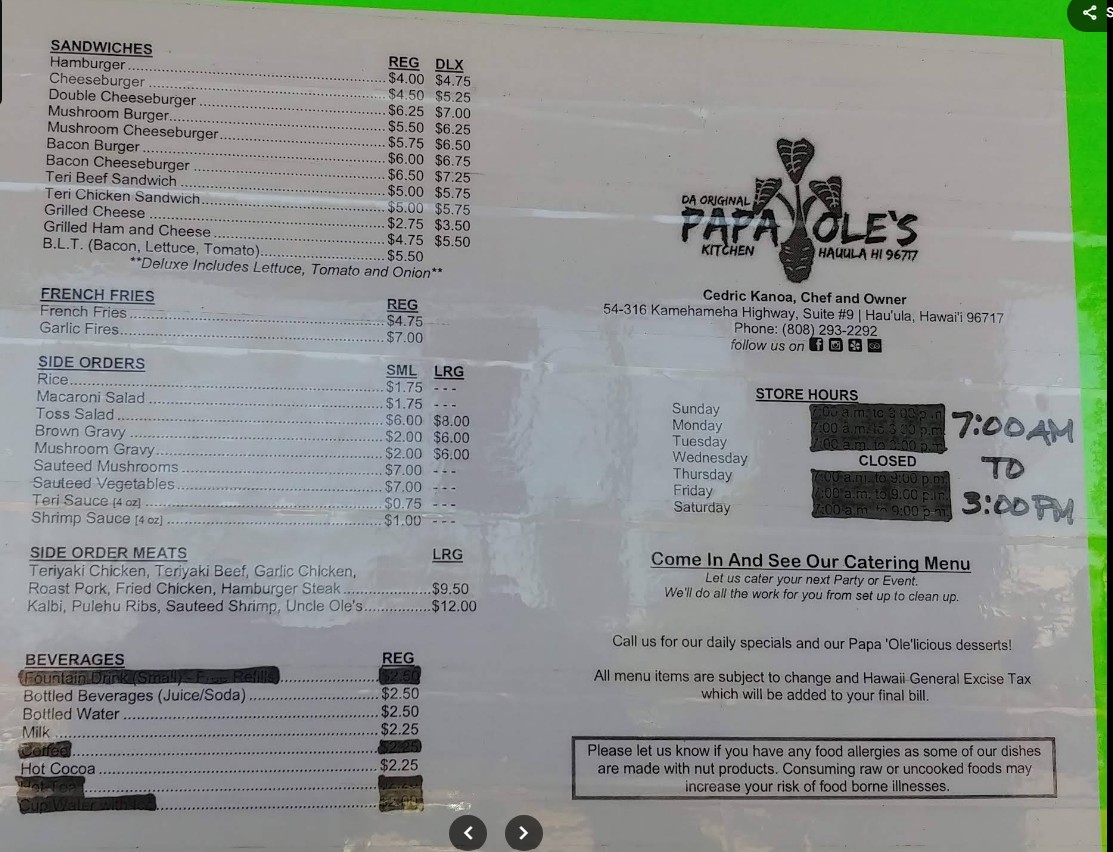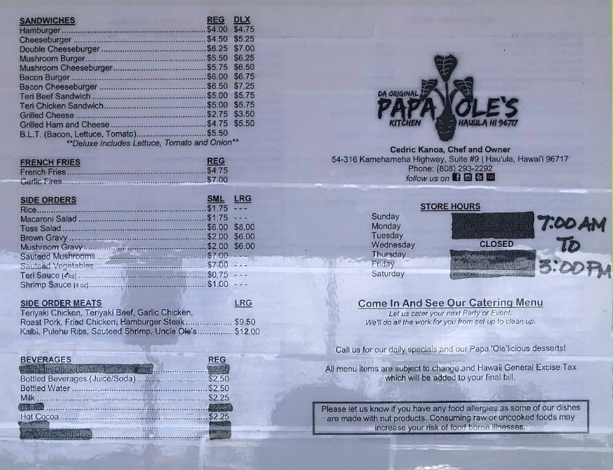 Welcome to Papa Ole's Kitchen, where we bring you authentic Hawaiian homestyle dishes that make you feel right at home! Whether you're craving a traditional Hawaiian breakfast, a hearty plate lunch, or a delicious dinner, we’ve got you covered. Our cozy, family-friendly spot offers a variety of freshly prepared dishes that reflect the true spirit of Hawaii. Located in Hauula, HI, Papa Ole's Kitchen is the perfect place to indulge in comfort food that tastes like it’s made with love. Stop by and treat yourself to a delicious meal today!